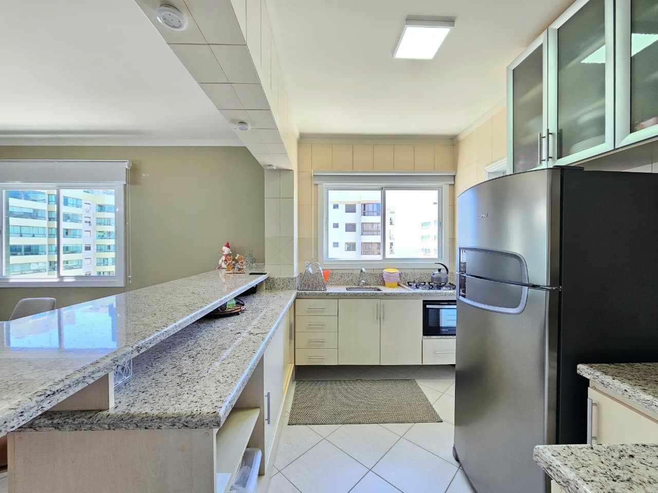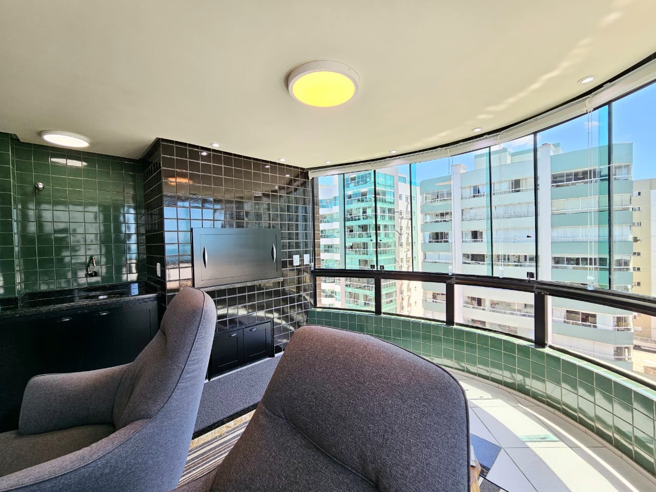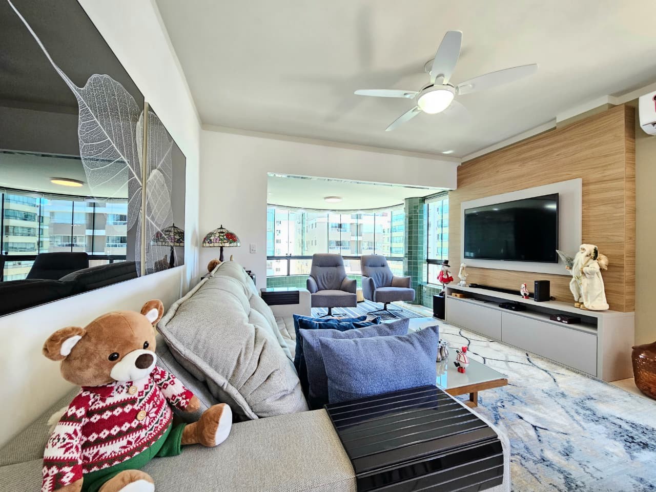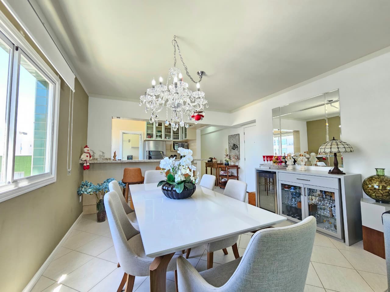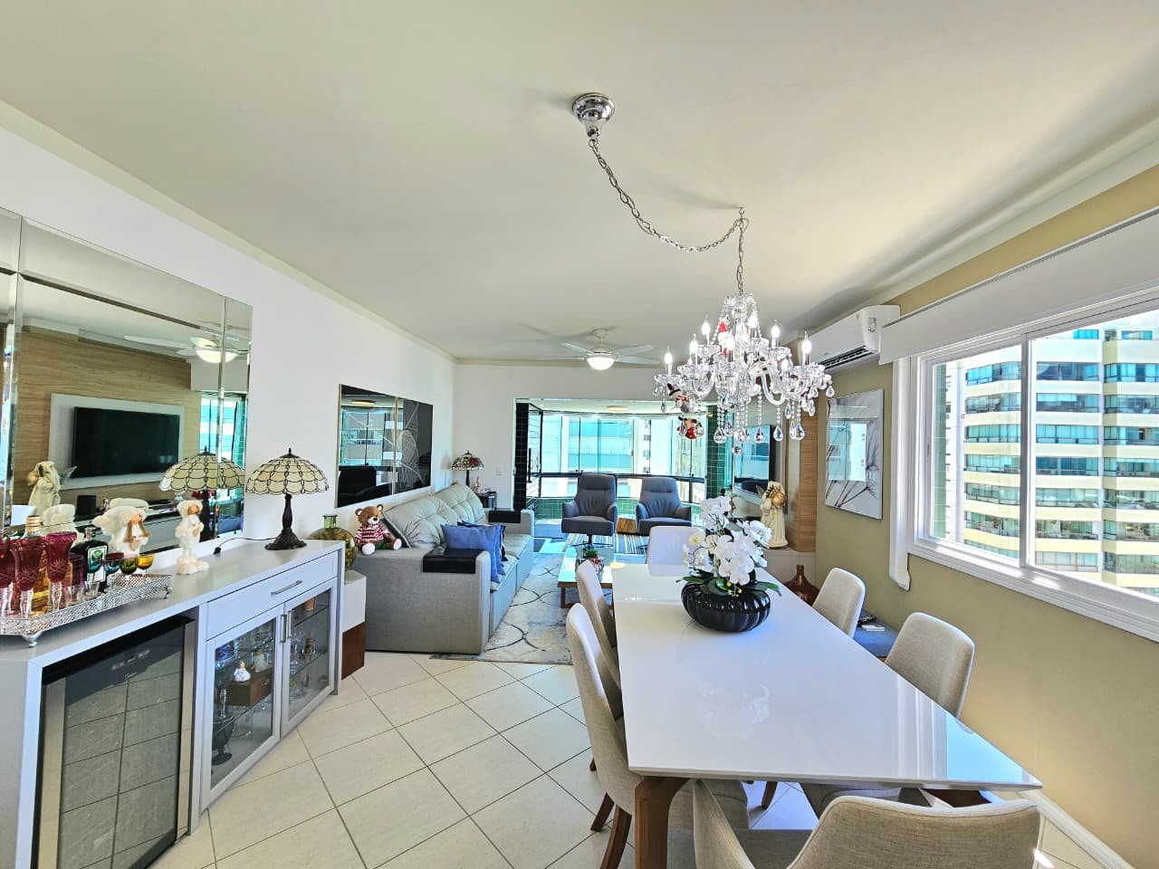 Apartamento com 122, 80m² de área privativa, de frente para Av. Ubirajara (Santinha), na melhor posição solar (leste/norte), com vista eterna e liberada para o mar, calçadão, composto de três amplos dormitórios, um sendo suíte com hidro, banhos social e lavabo, cozinha com bancada, área de serviço separada, um amplo living em 3 ambientes, estar, jantar e um sacada separada com churrasqueira e bancada com pia auxiliar, vista liberada para o mar de todos os cômodos do imóvel, imóvel todo mobiliado, equipado e climatizado, mais uma bom box de estacionamento. Edifício de alto padrão construtivo e de acabamento, fachada revestida com pastilhas de cerâmica, fachada imponente, próximo da beira mar e demais recursos da praia, dois elevadores, gás central, água quente, luz de presença nas áreas sociais, zeladoria, portão e porteiro eletrônicos.